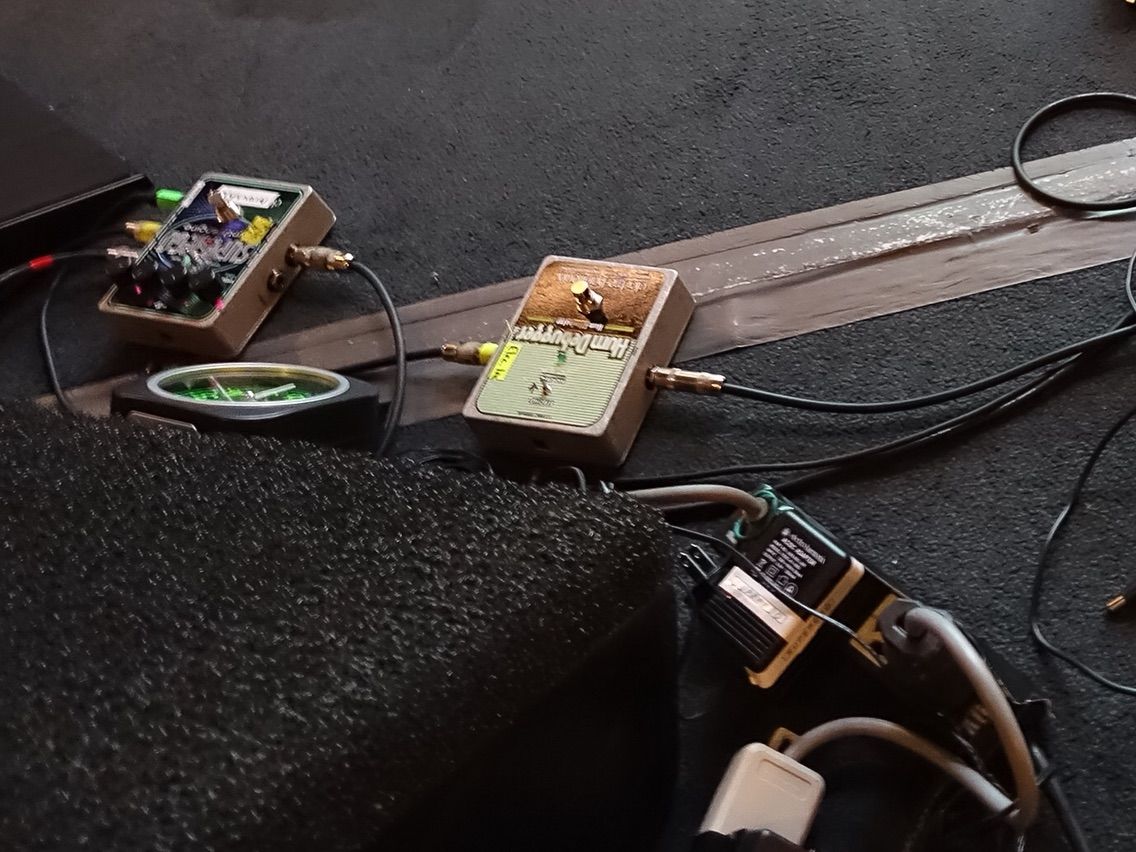 ところで、2016年の来日時の写真をアップし忘れてしまっていましたので、この機会にアップしておきます。Pat Methenyは2016年の来日時に、Electro-Harmonix の「Hum Debugger」を使っていました。これは、Ibanez PM-200を使っている頃は使っていなかったようです。Daniel Slamanのギターを使うようになって、ピックアップがHumbuckerからCharlie Christianになったため、ノイズを減らす必要が出てきたためではないかと思われます。